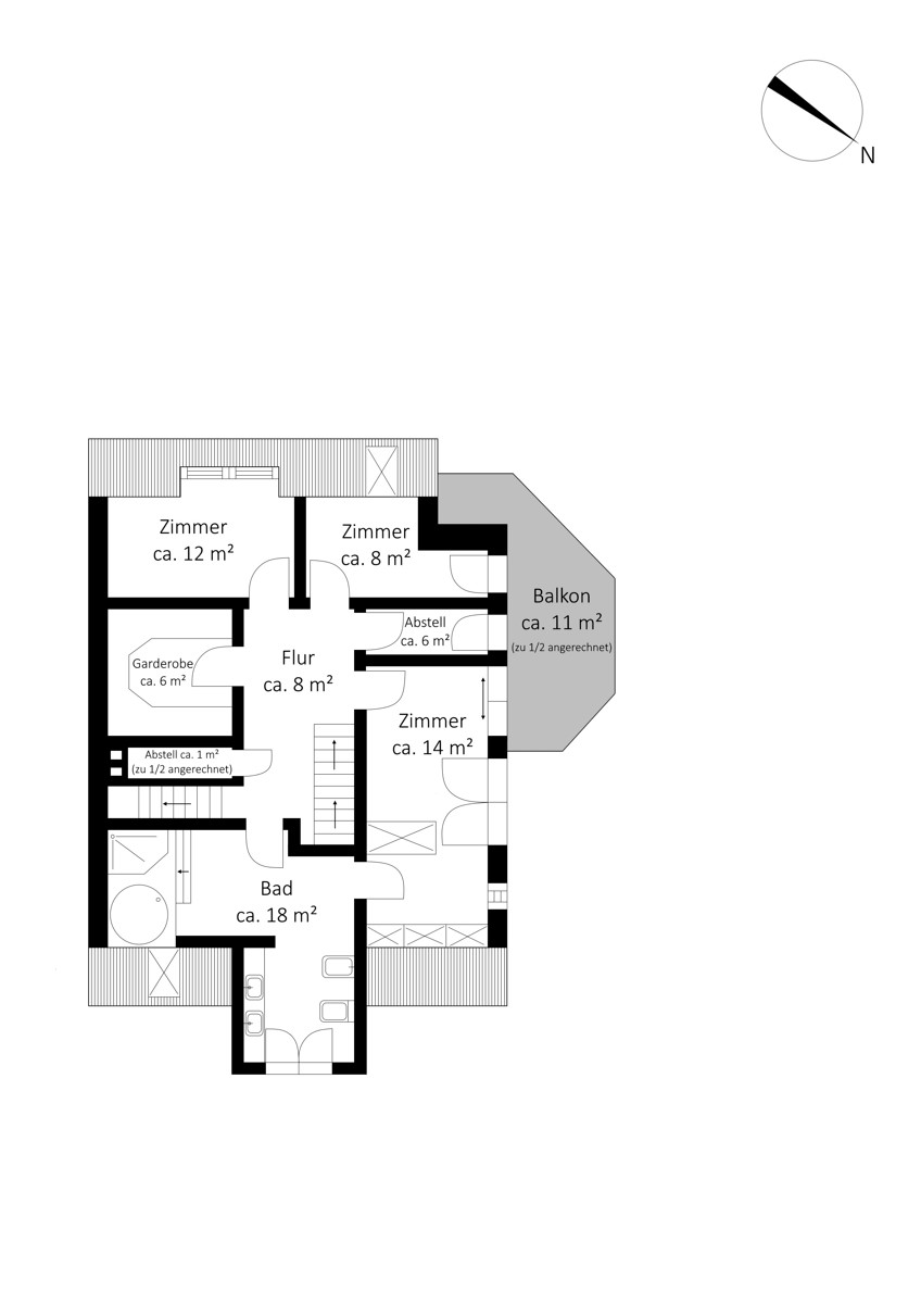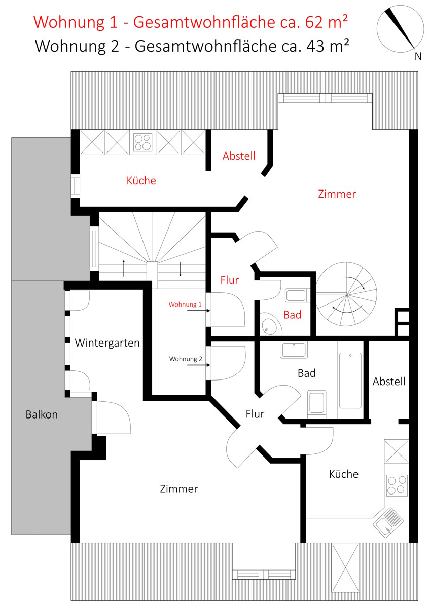 – Wohnung 2: 43 m², 1 Zimmer, Vollbad, Balkon