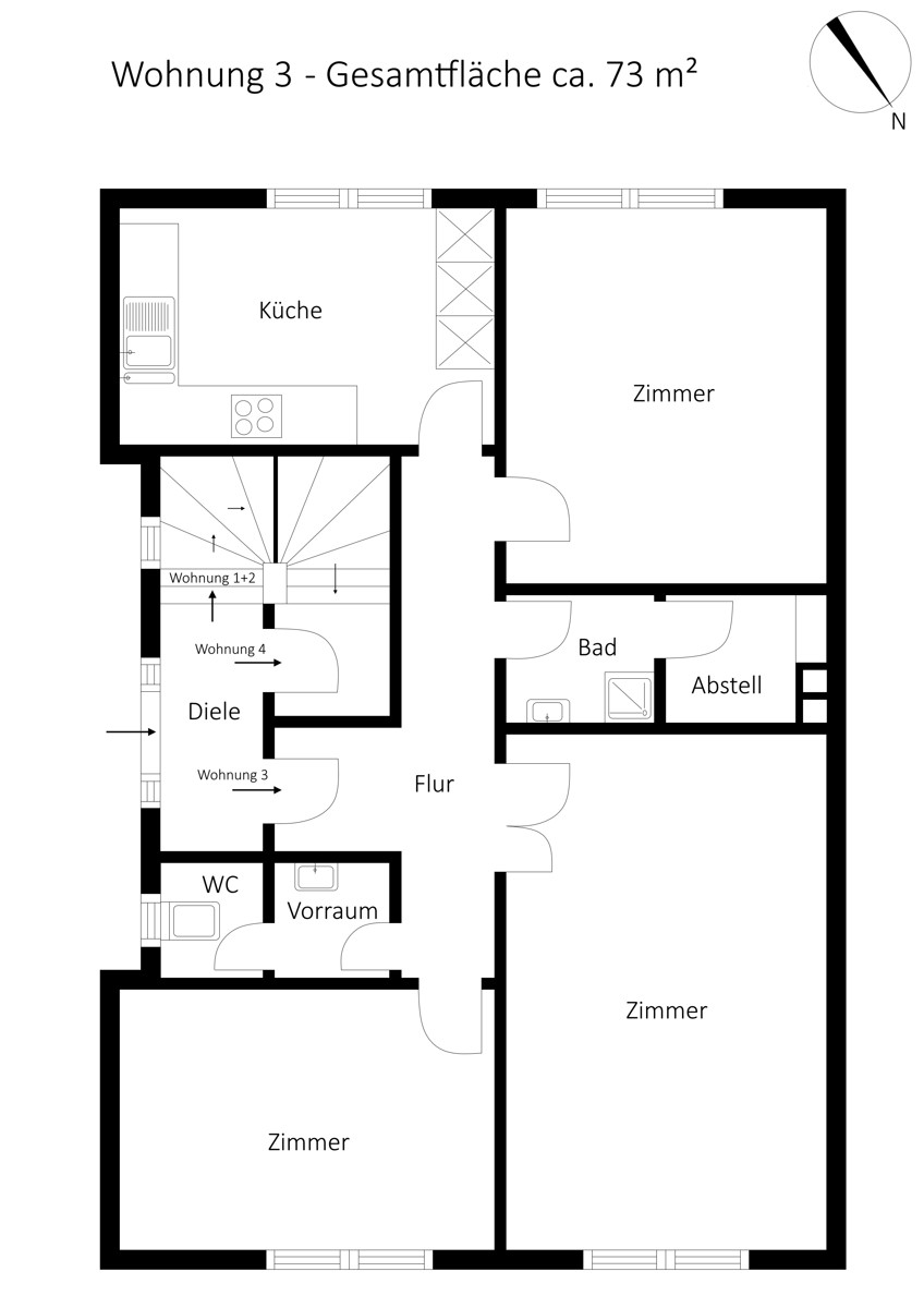 – Wohnung 3: 73 m², 3 Zimmer, Duschbad