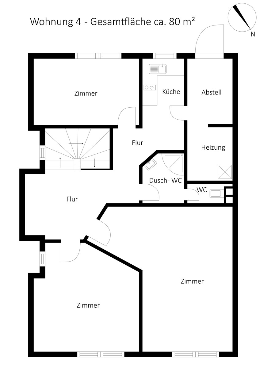 – Wohnung 4: 80 m², 3 Zimmer, Duschbad