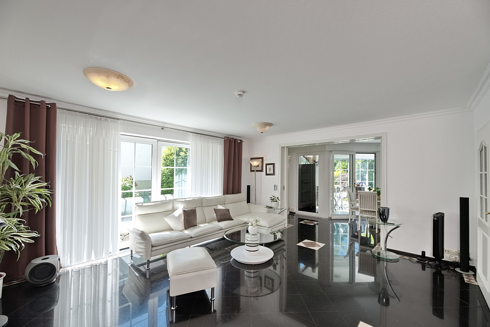 Die Doppelhaushälfte ist mit 265 m² und sieben Zimmern großzügig und repräsentativ. Dieser ist mit 940 m² der größte Teil des Grundstückes zugeordnet, auf welchem sich ein schön angelegten Garten befindet.