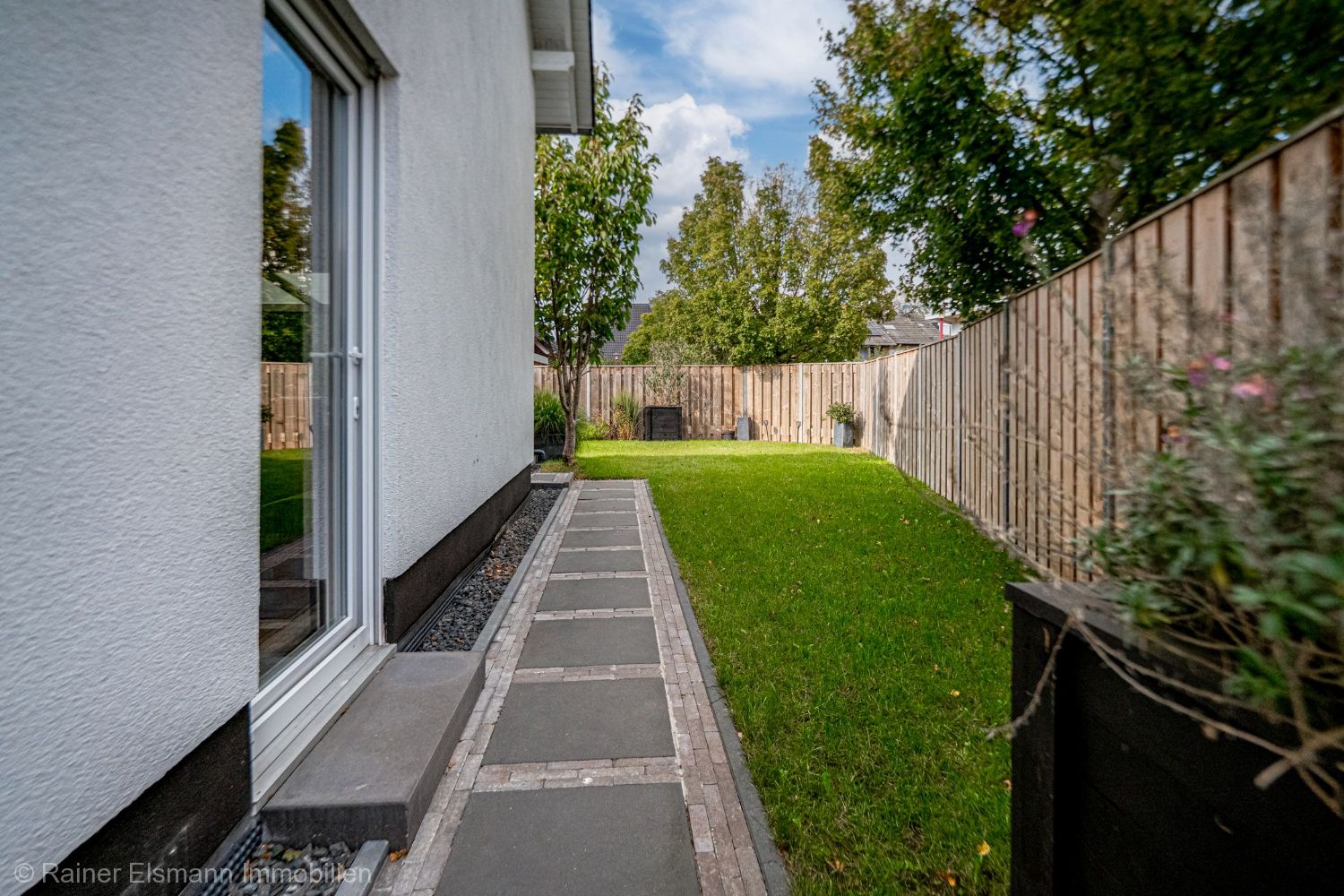 Das ca. 282 m² große Grundstück begeistert mit einem liebevoll gestalteten Garten. Mehrere Sitzbereiche, blühende Beete, Sträucher und Bäume fügen sich harmonisch in einen dekorativen Steingarten