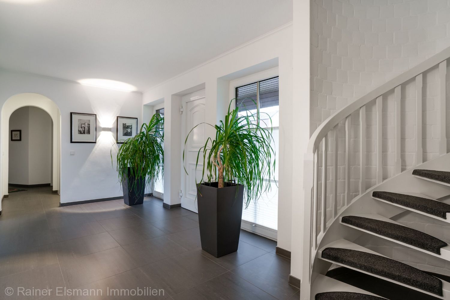 Geräumige Wohndiele mit massiver Holzwendeltreppe ins Dachgeschoss
