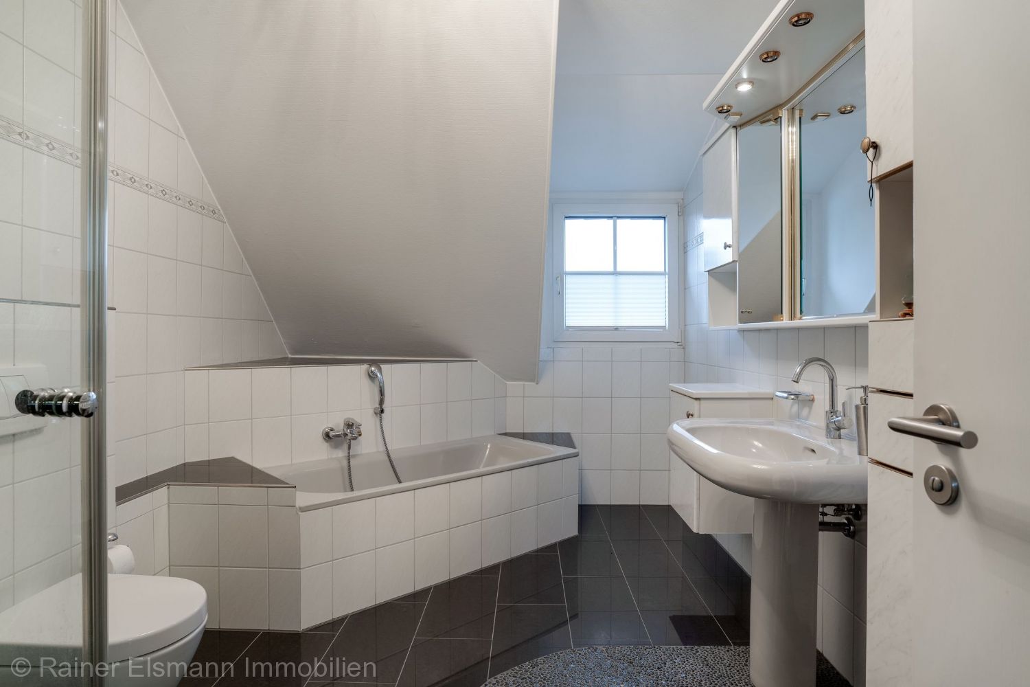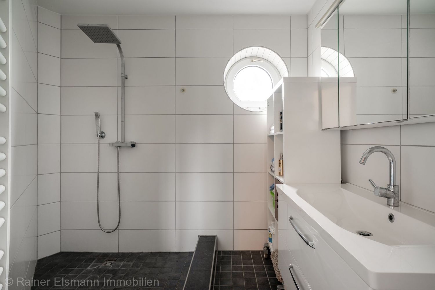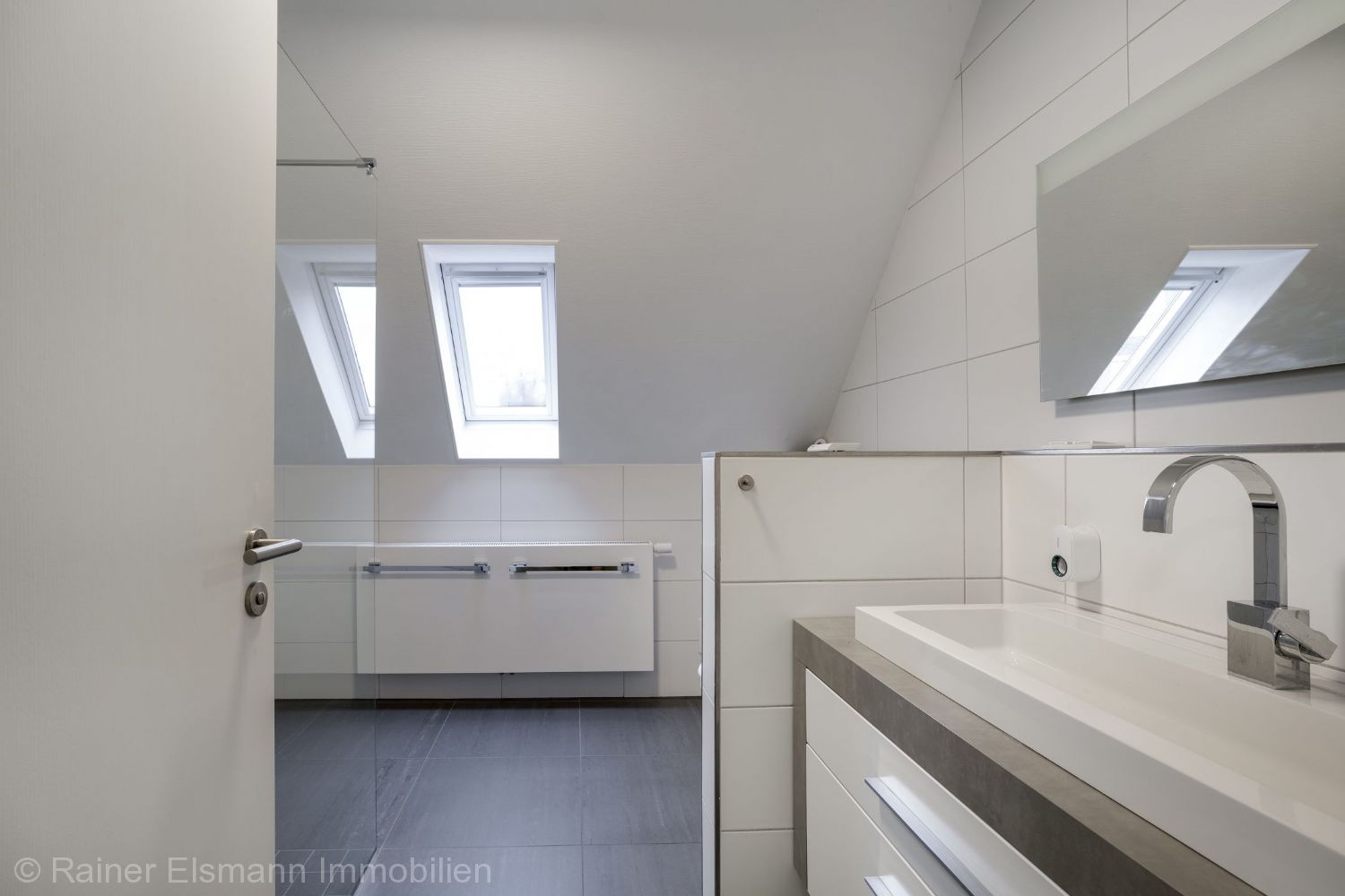 – Hauptbad mit Dusche, Badewanne, WC, Doppelwaschtisch, Designheizkörper