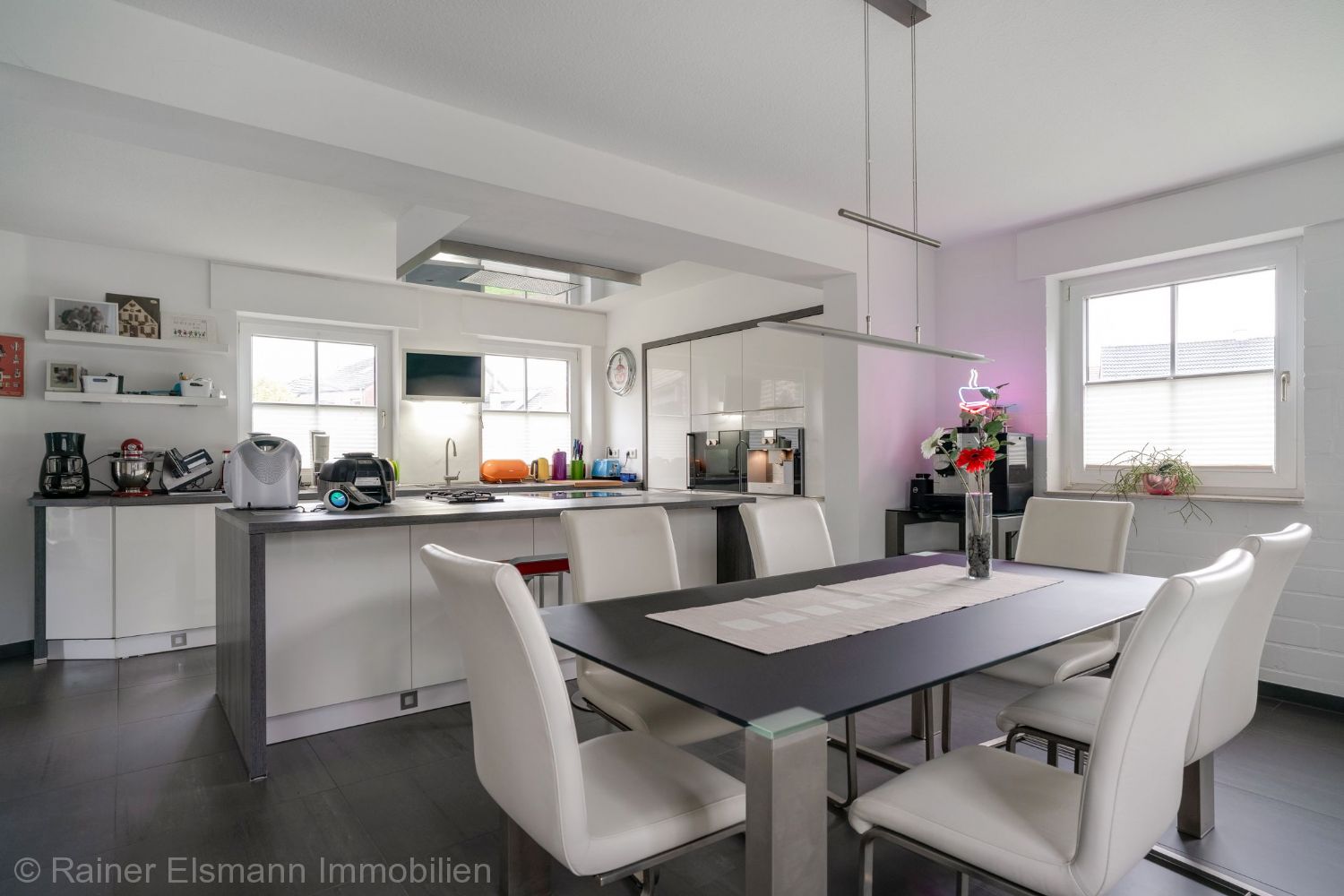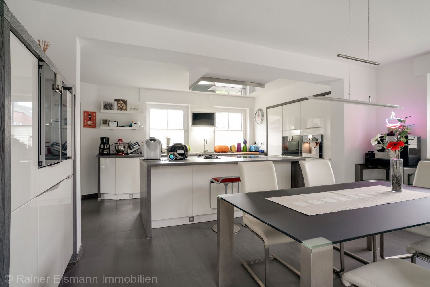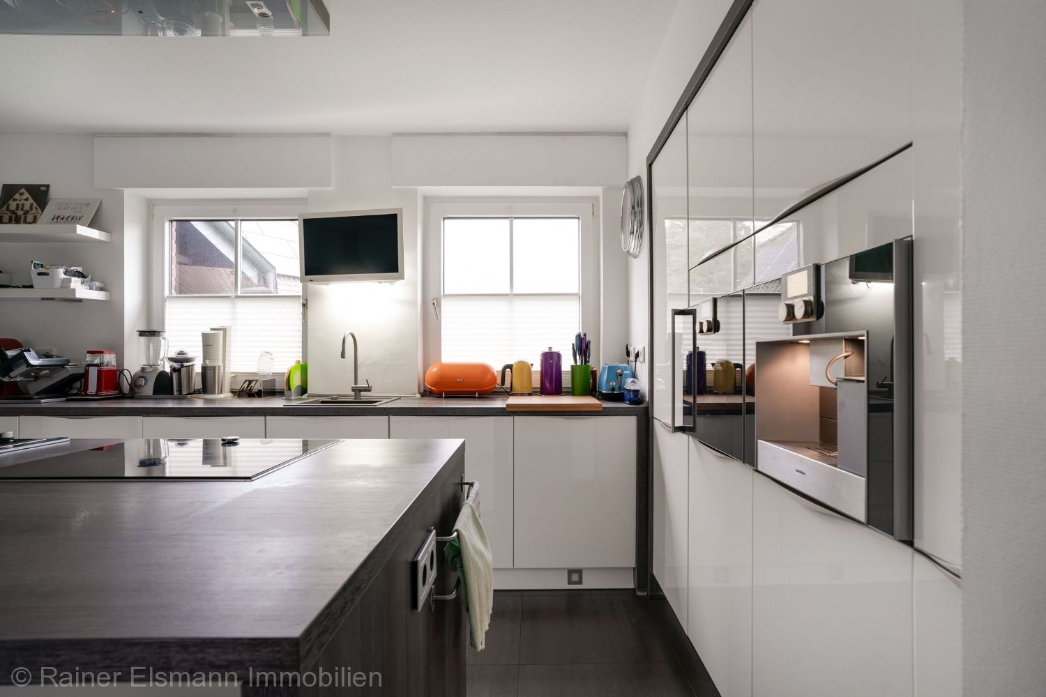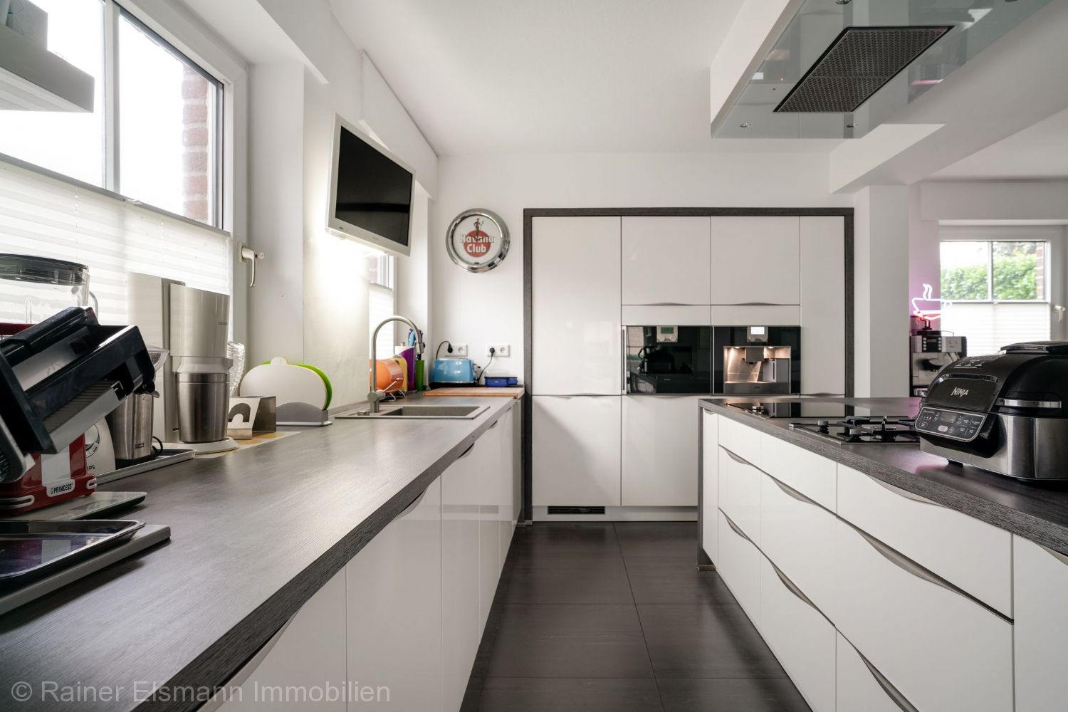 Moderne, offene Küche mit hochwertigen deutschen Markengeräten: Dampfgarer, Kombi-Ofen, Spülmaschine, Kühlschrank, Gefrierschrank, Induktionsherd, Backofen, Gasherd mit 2 Flammen