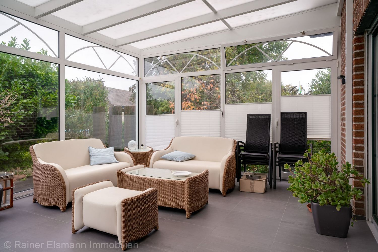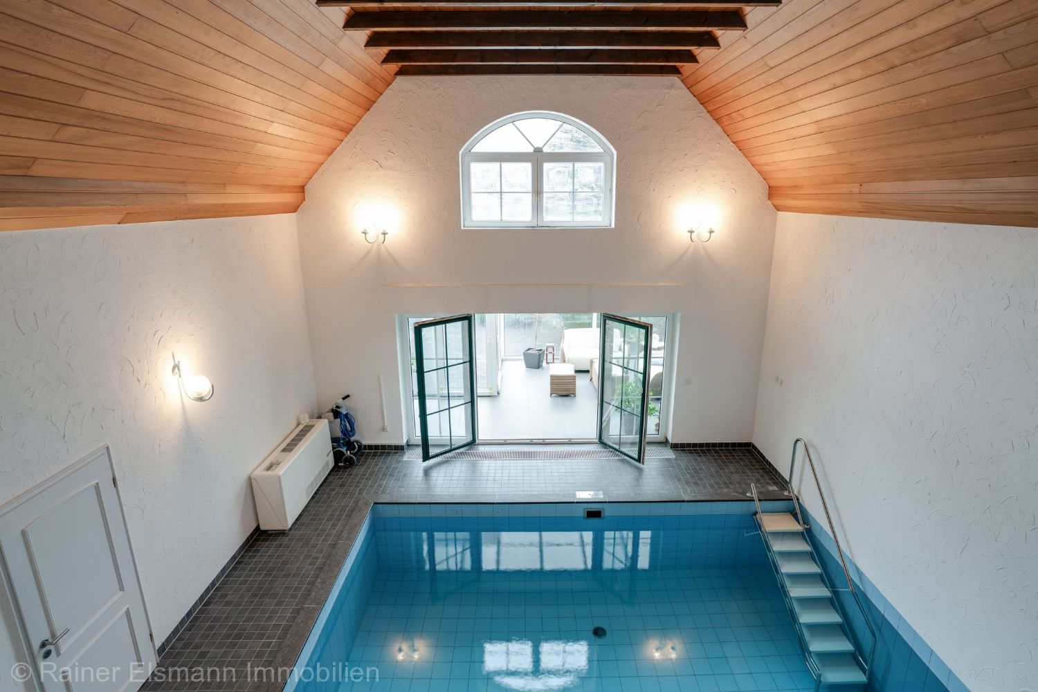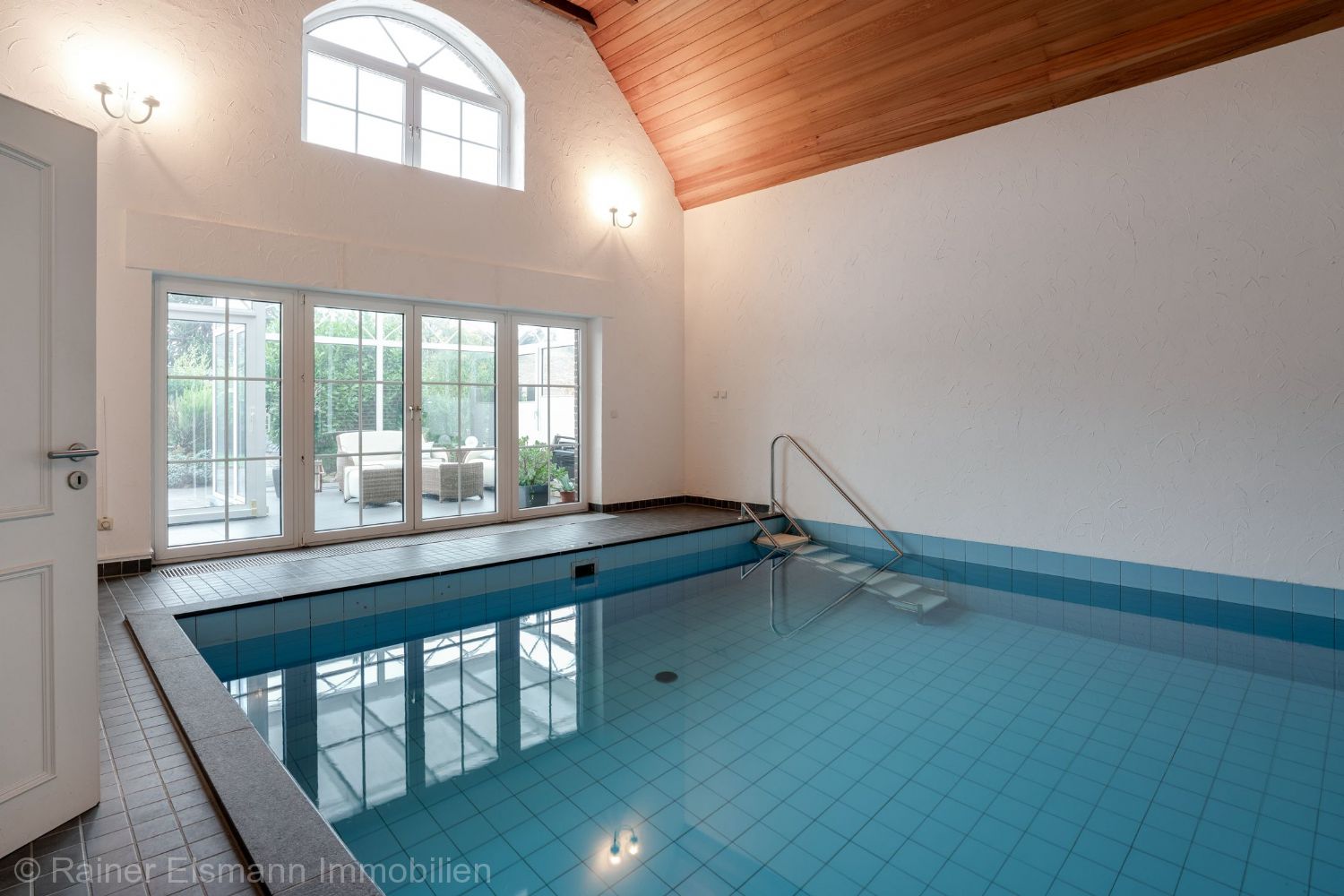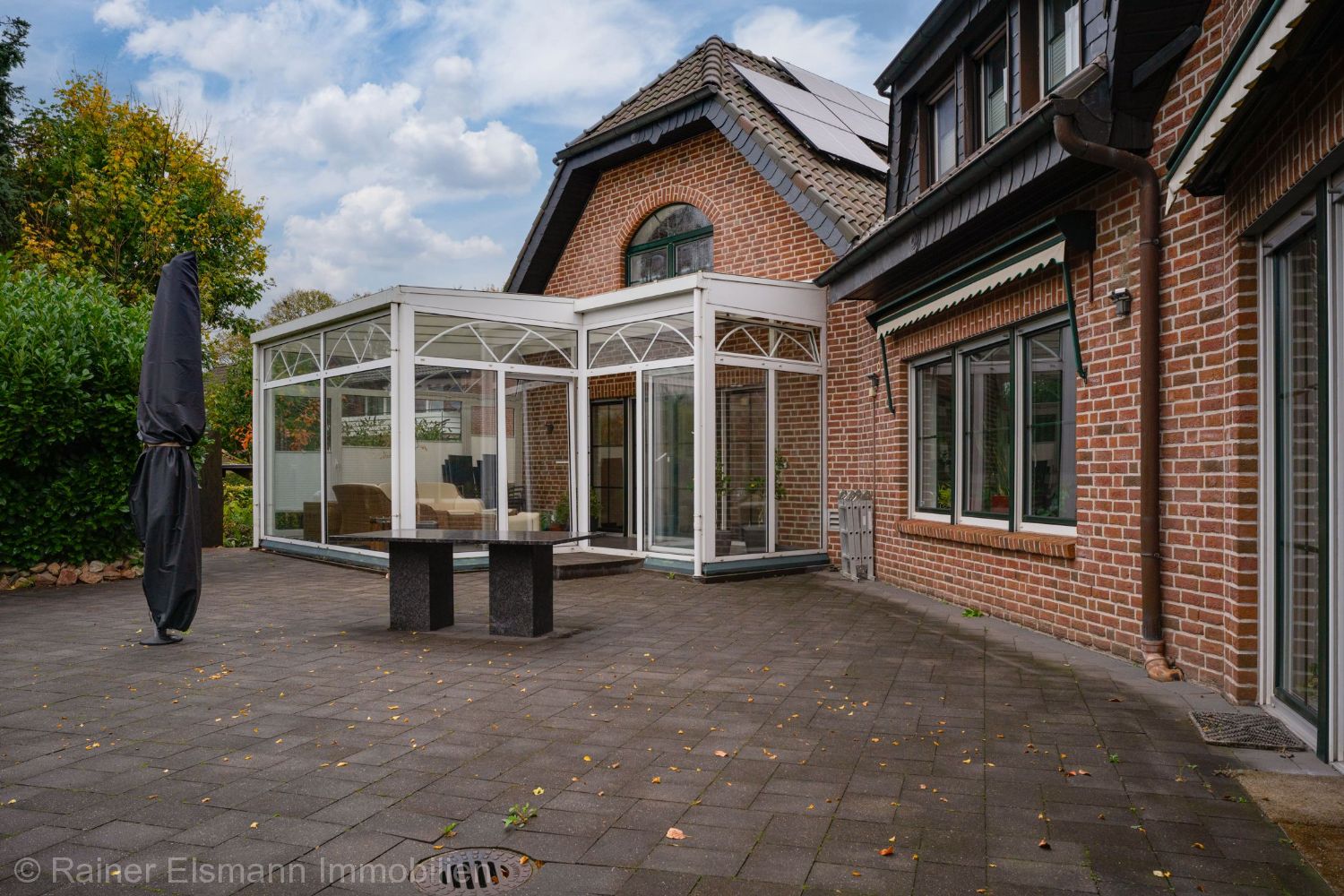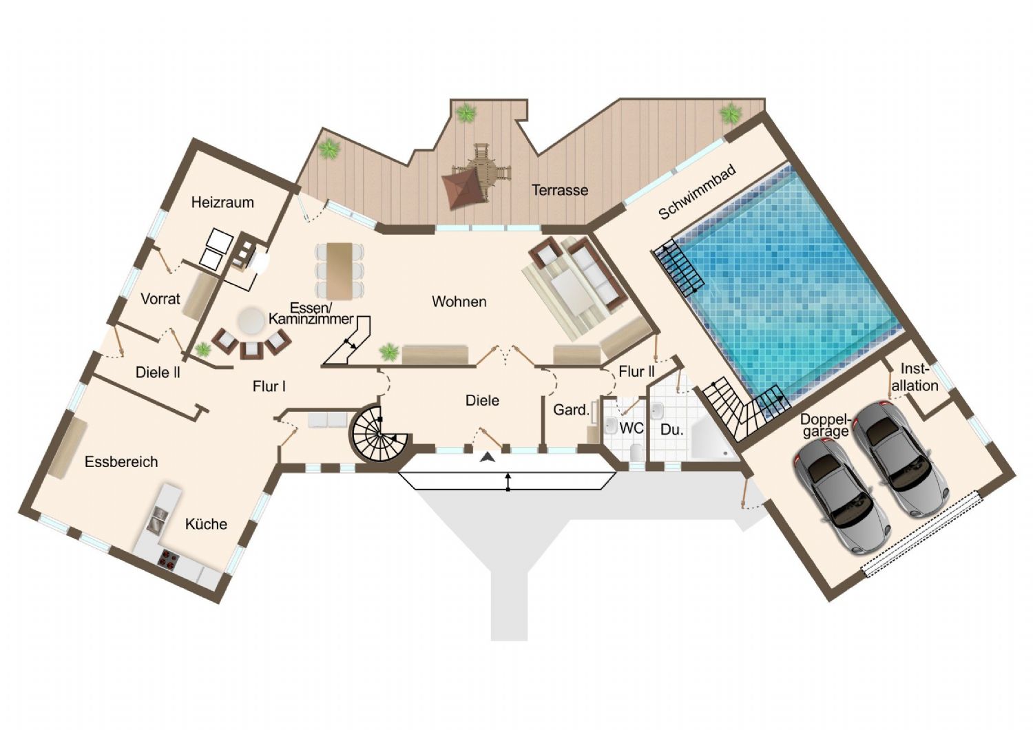 Diele, Gäste-WC, Wohn-/Essbereich, Kaminzimmer, Offene Küche, Abstellraum neben der Küche, weiterer Abstellraum und Hausanschlussraum, Schwimmbad, Doppelgarage, beheizter Wintergarten
