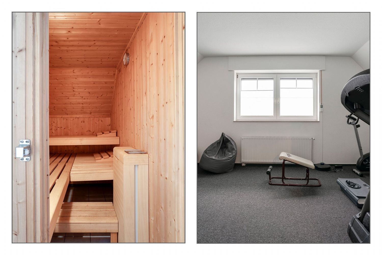 Großzügiger Flur, vier Schlafzimmer (davon drei besonders geräumig), Büro, zwei Badezimmer, Abstellraum, Sauna und Fitnessraum mit Zugang zum Schwimmbad