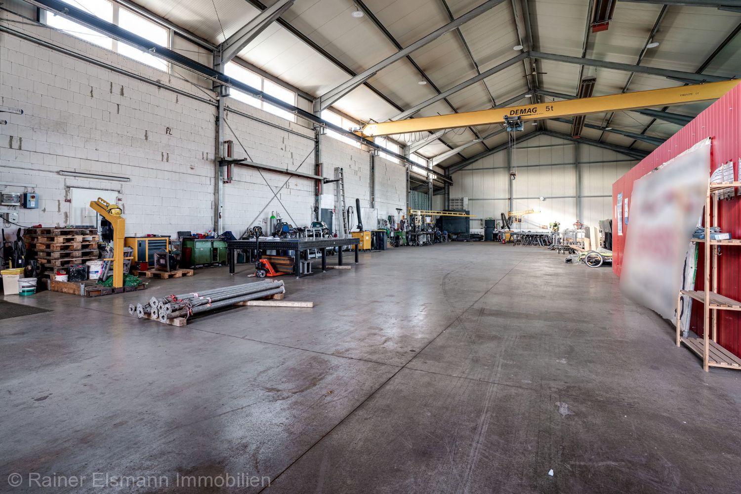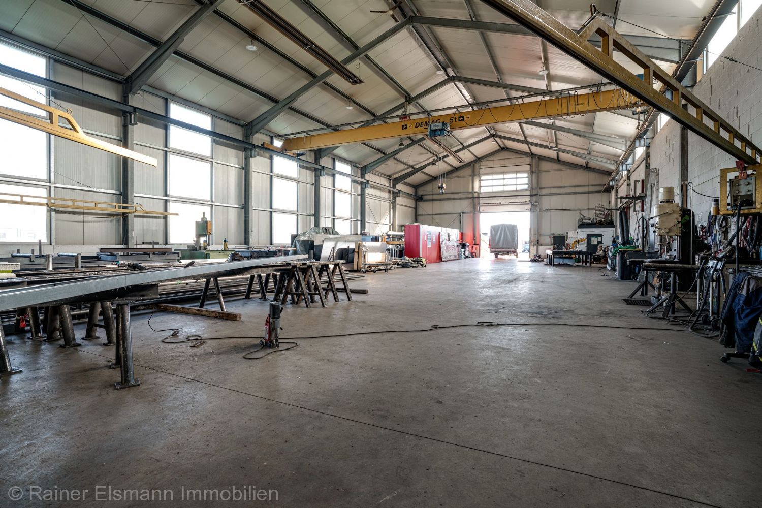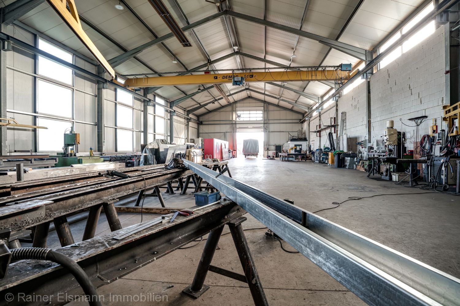 moderne isolierte Halle (7 m bis Traufe) bzw. Produktionsbereich und Lager mit Kranbahn (Tragkraft von 5 t), Rolltor von ca. 4,25 m Höhe und 5 m Breite.