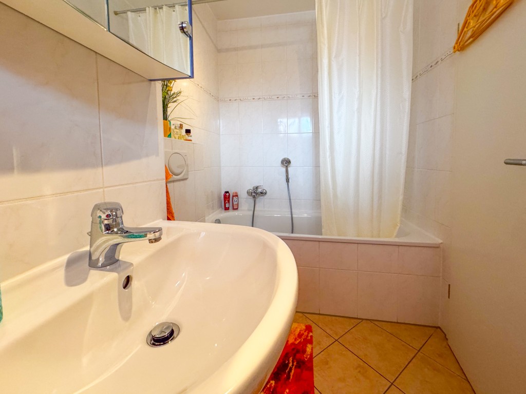 – Deckenhoch gefliestes Bad mit heller Sanitärkeramik.