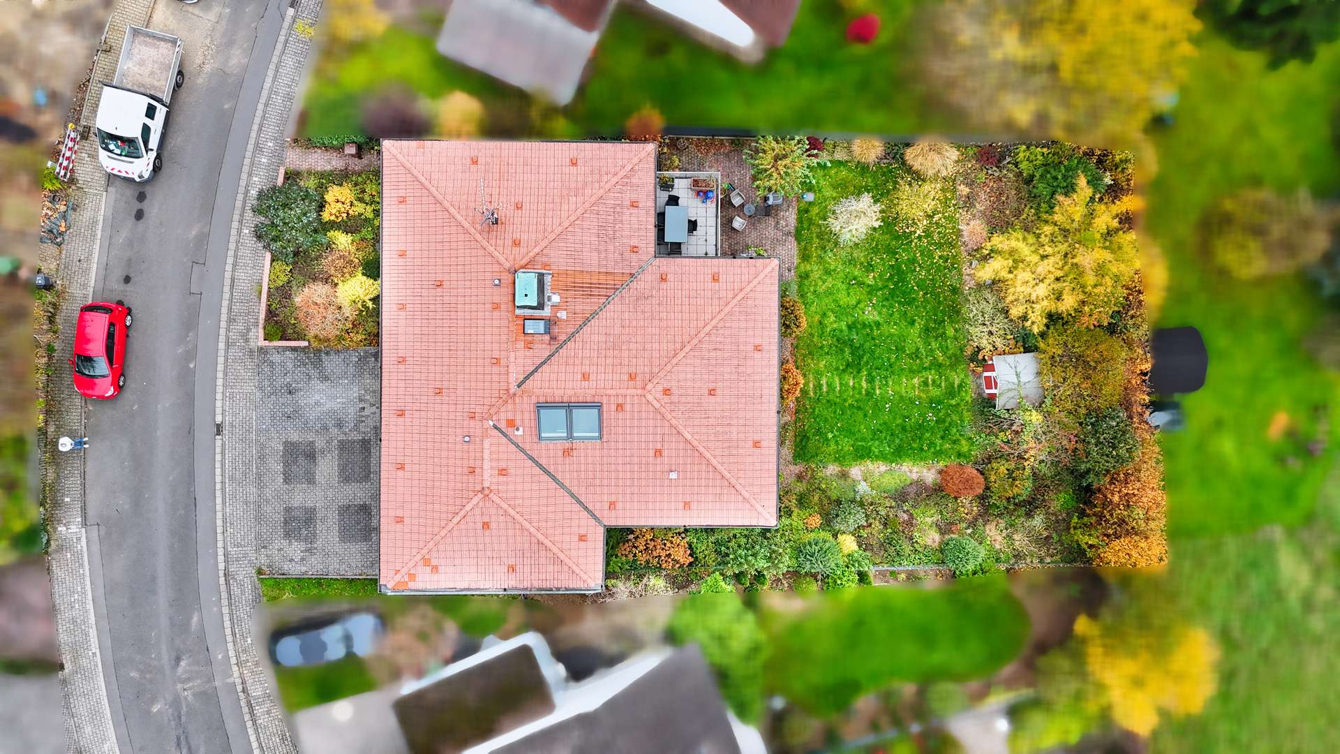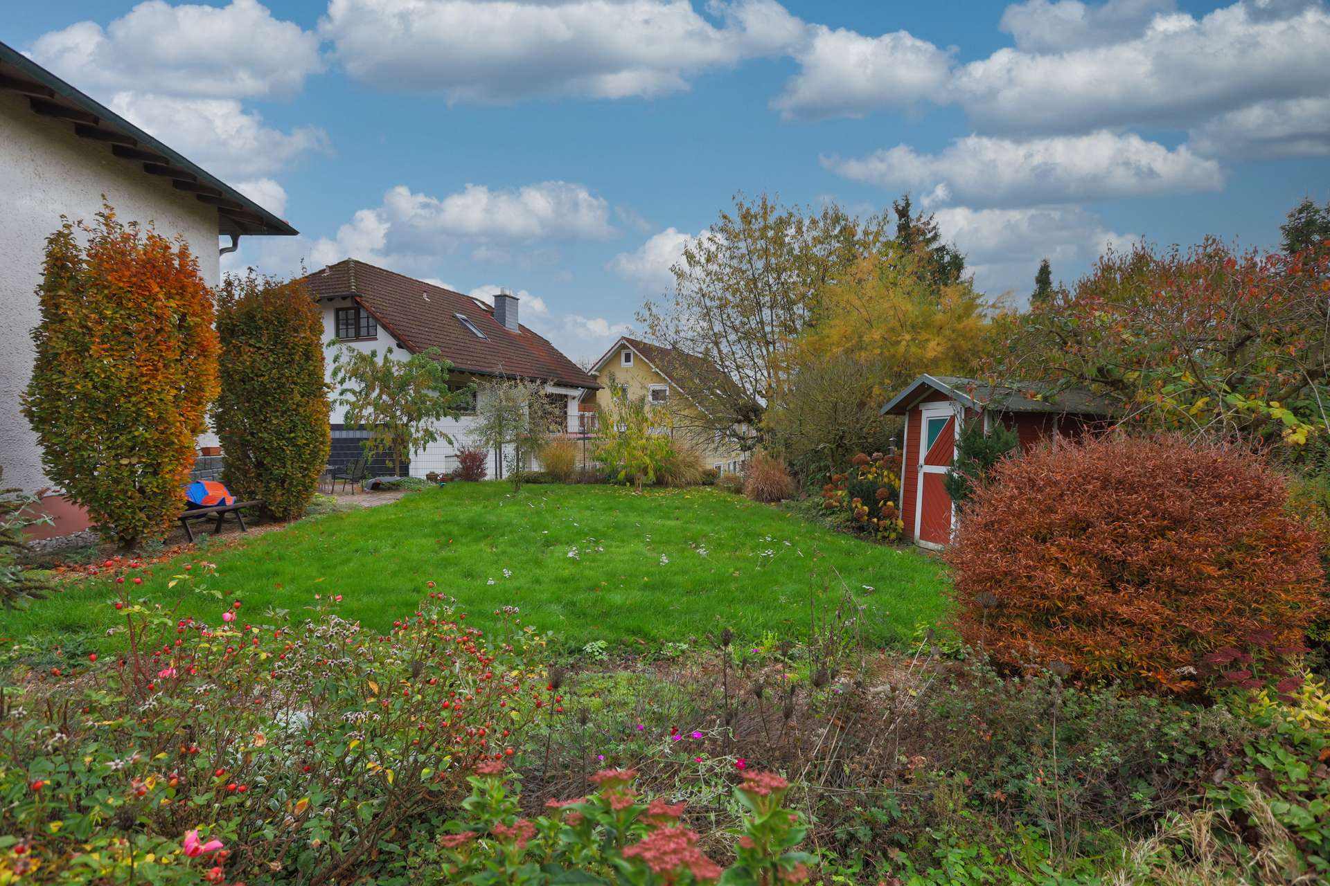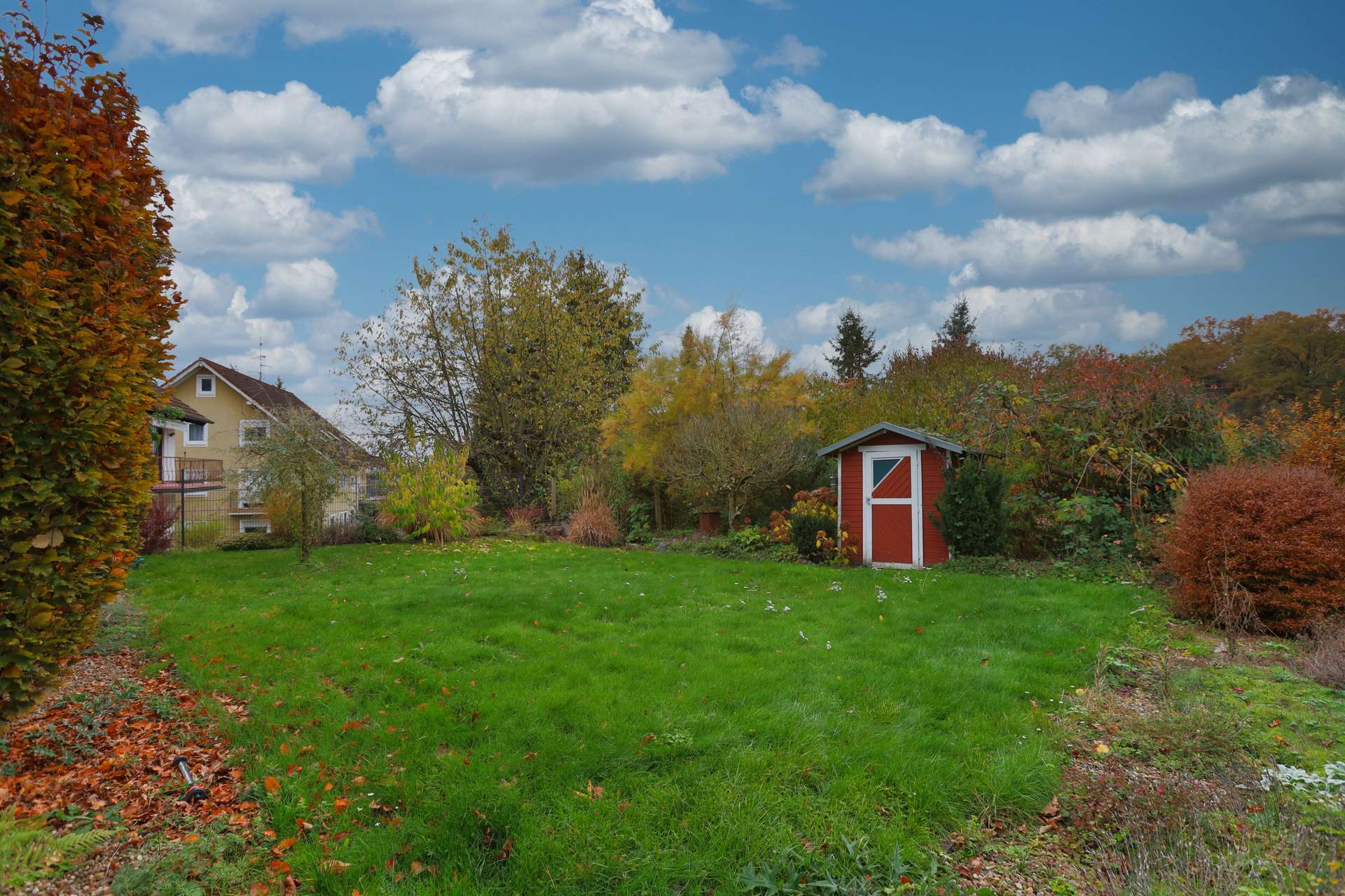 Das rund 750 m² große Grundstück bietet maximale Privatsphäre, sonnige Rückzugsorte und Raum für Entspannung im Grünen.